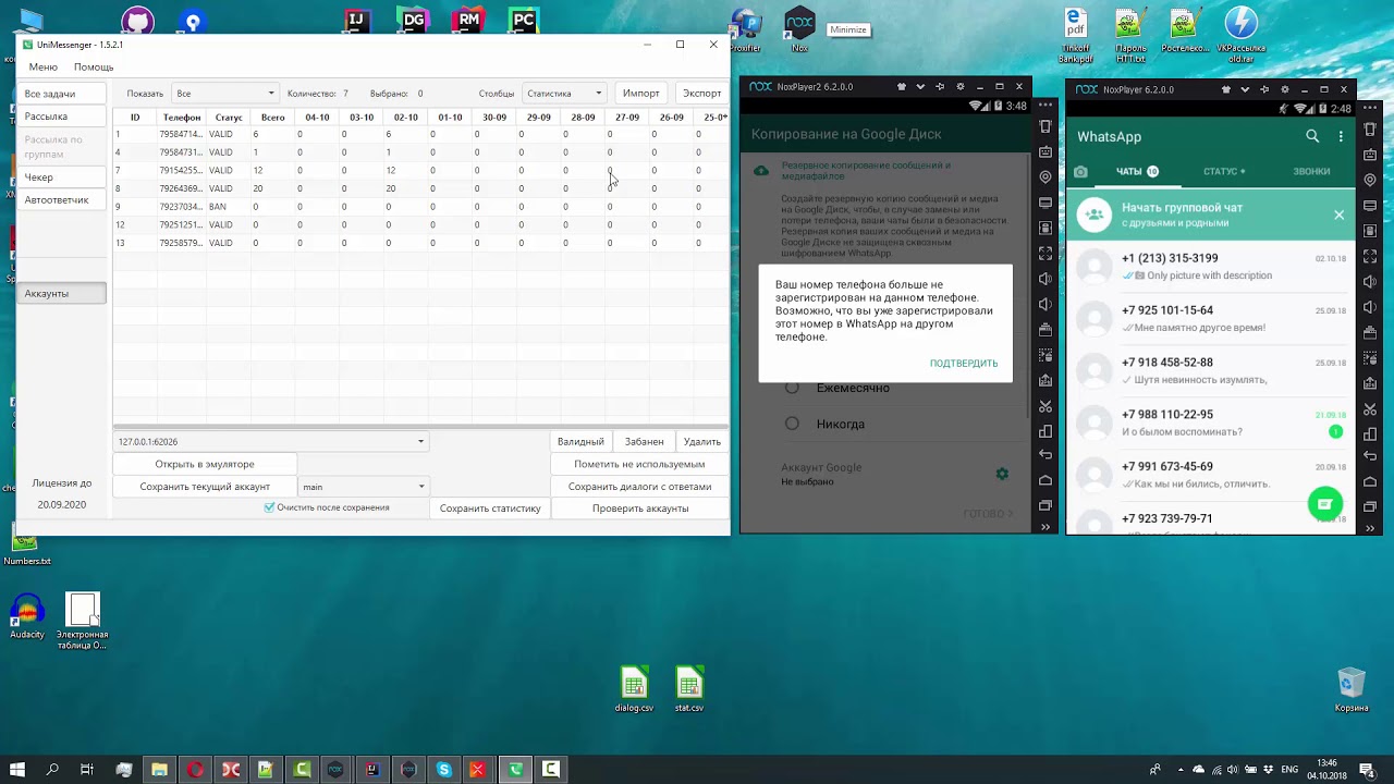 — Причина бана – может быть VIEW (из-за того что на экране найден соответствующий текст); ERR_MSG (если помечен забаненным из-за того, что не получилось отправить n(задается в настройках) раз подряд сообщение с аккаунта); NOT_REG (на аккаунте не завершена регистрация); MANUAL (помечен забаненным вручную).